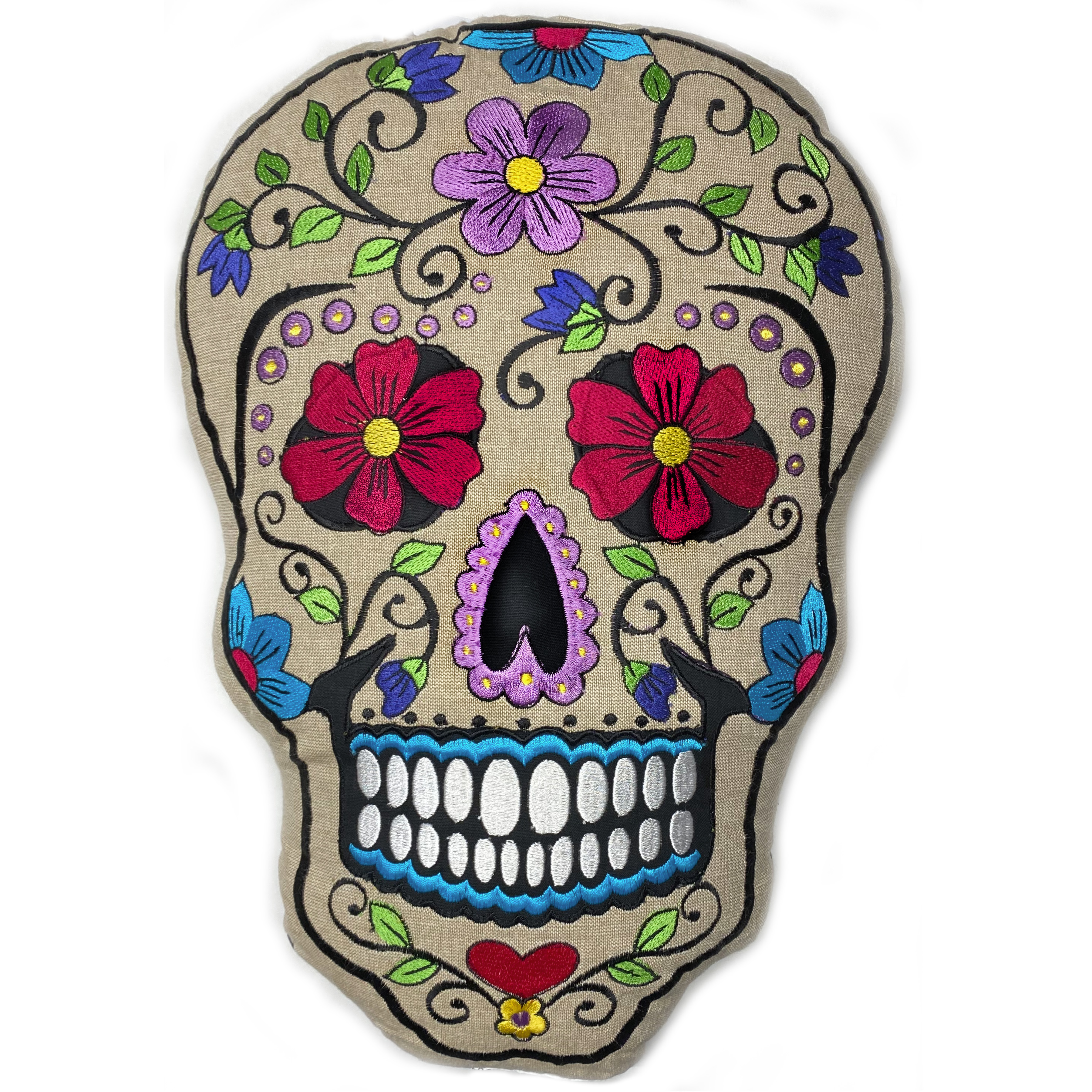This large embroidered sugar skull pillow can be used year 'round, not just for Halloween or Day of the Dead. Details are embroidered on a light tan background and the back is black.