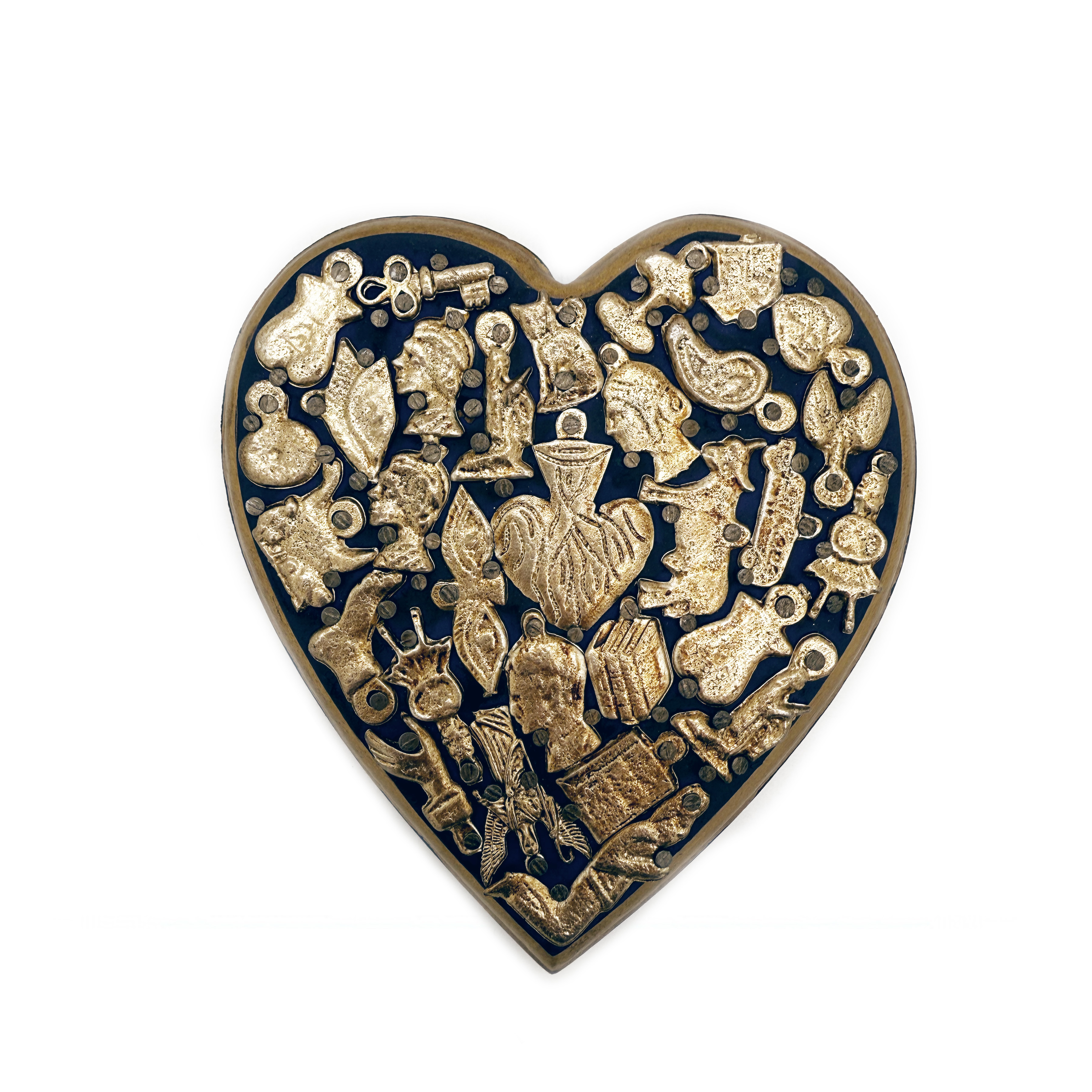 This medium wooden heart is painted matte purple and covered in Milagros with a rustic gold trim detail. Milagro is the Spanish word for miracle and each charm represents wishes, prayers and thanks. Hearts may represent love, valor, loyalty, kindness, friendship and more. The back painted solid black with hole for hanging.