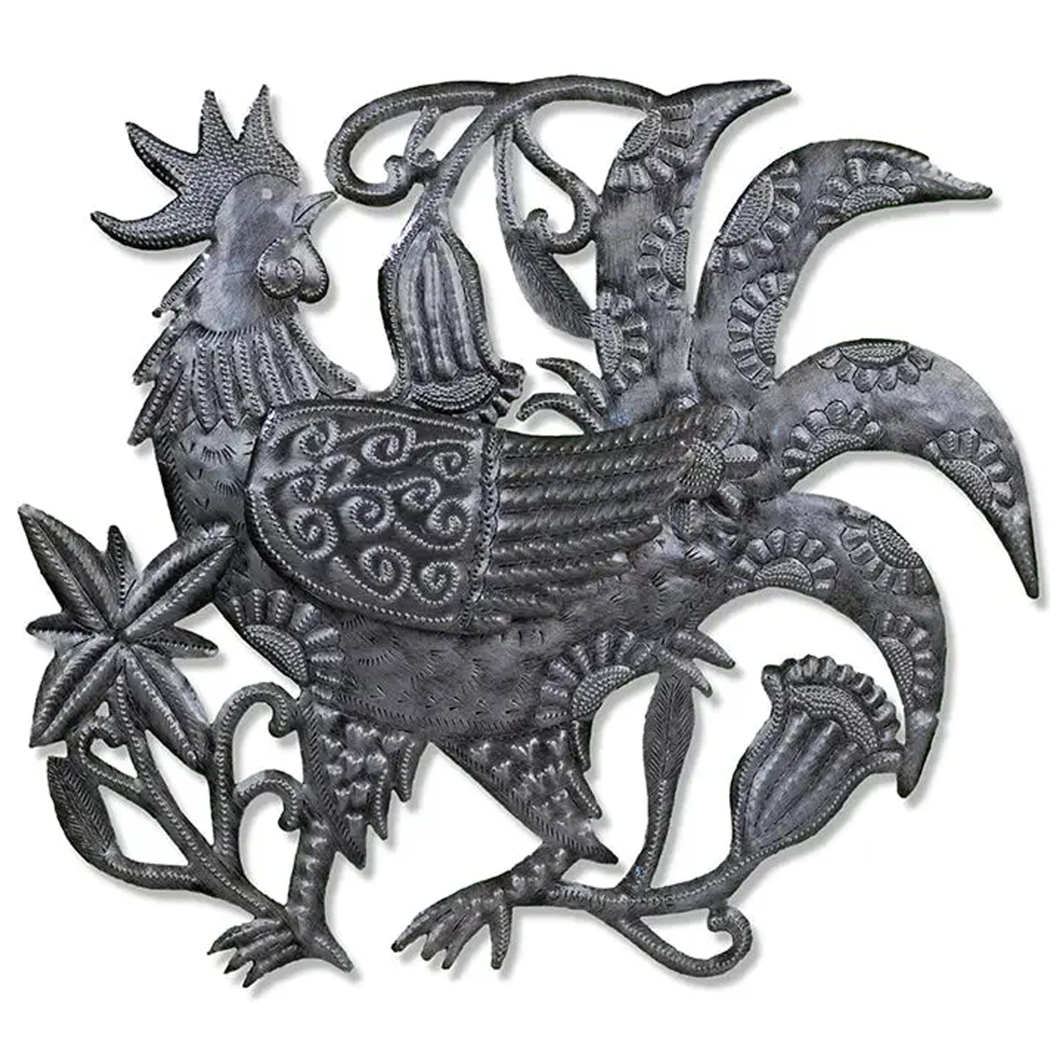 Steel oil drum art from Haiti can be beautiful, whimsical, religious and highly decorative. It's made of recycled material. The Haitian artist begins with a 55 gallon steel oil barrel which they split open and flatten out as a large a sheet of canvas. The artist first sketches out the design with chalk then cuts the steel using only a hammer and a nail. The round sculptures are made from the lid or bottom of a 55 gallon barrel. Each sculpture is signed by the artist. These sculptures are great indoor or out. When used outdoors the finish will begin to rust slowly and naturally. If you want to maintain the original look spray the piece with clear varnish.