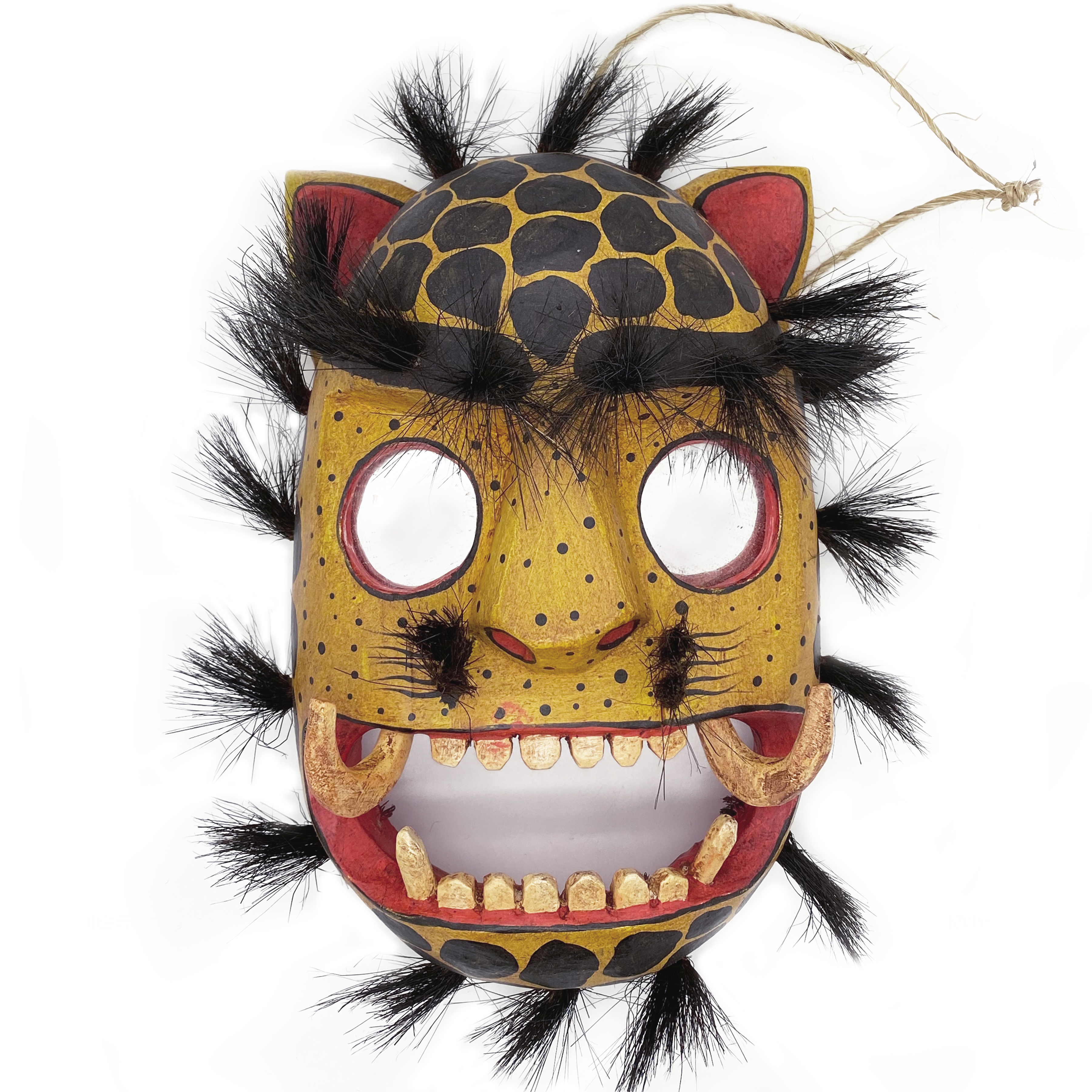 This hand-carved wooden mask from Guatemala is painted in fine detail to capture the spirit of animals from the Mayan culture. Traditionally worn in Mayan dances, it now makes a striking decorative piece that brings vibrant, cultural artistry to your home. A small hole at the top allows for easy wall hanging.